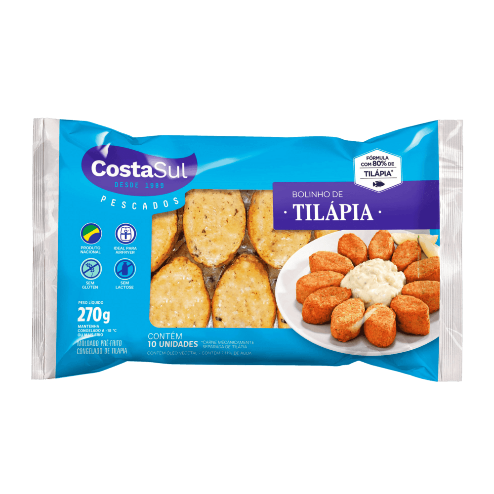 produzido pela renomada marca costa sul, referência na produção de pescados, o bolinho tilápia é uma opção saudável e deliciosa para incluir em suas refeições. com apenas 270g, é perfeito para uma porção individual ou para compartilhar com os amigos e familiares.
