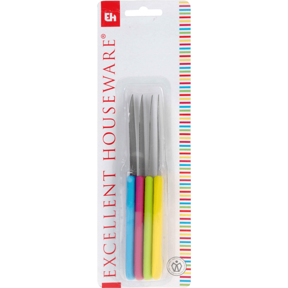 a cj faca coz inox é um conjunto de facas construídas em material de aço inoxidável, resistente em sua estrutura e durável ao tempo e às condições normais de uso. são quatro facas coloridas que trazem presteza e satisfação ao cozinhar. vem com uma faca para cortar carne, uma faca de pão, uma faca de peixe e uma faca de legumes.