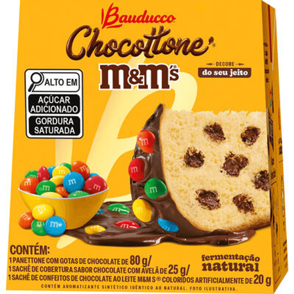 Kit Panettone Com Gotas De Chocolate 80g + Sachê De Cobertura Chocolate Com Avelã 25g Bauducco Chocottone + Sachê De Confeitos M&ms 20g - Mini Chocottone M&M's Bauducco 80g