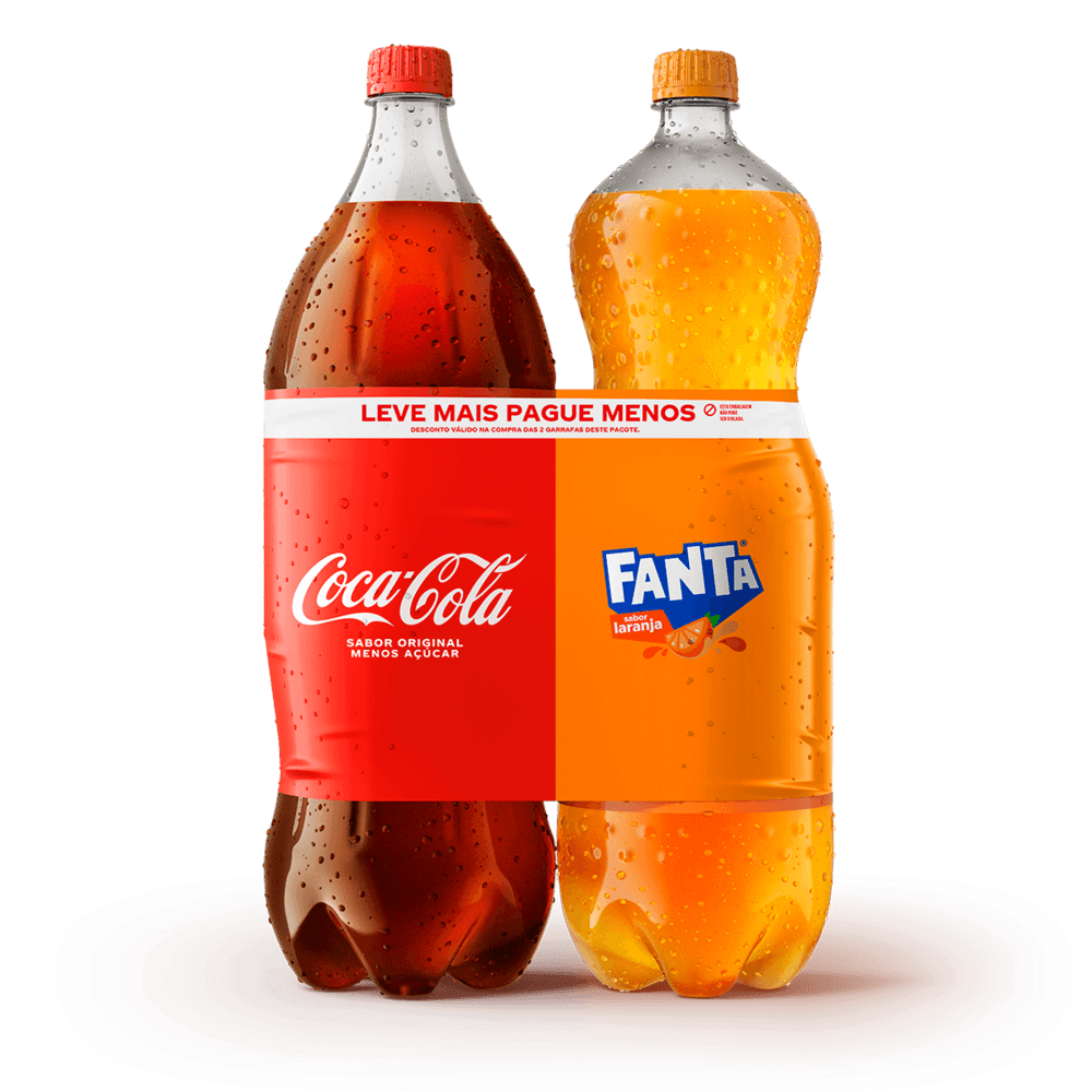 ingredientes: coca-cola: água gaseificada, açúcar, extrato de noz-de-cola, cafeína, corante caramelo iv, acidulante ácido fosfórico, aroma natural e edulcorante sucralose (4,4mg) por 100ml. fanta laranja: água gaseificada, açúcar, suco concentrado de laranja (4,2% de suco) e suco concentrado de maçã (1,0% de suco), reguladores de acidez ácido cítrico e citrato de sódio, aromatizante, conservadores benzoato de sódio e sorbato de potássio e corante artificial amarelo crepúsculo fcf.