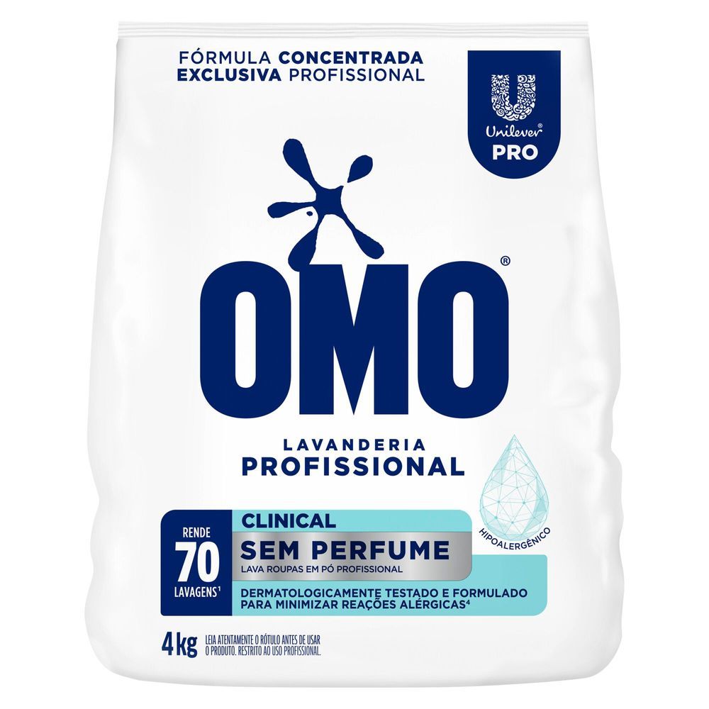 O Lava Roupas em Pó OMO Lavanderia Profissional Clinical foi criado para facilitar o dia a dia dos profissionais de saúde. Este sabão em pó, sem fragrância, possui um magnífico poder de limpeza e formulado para minimizar reações alérgicas e irritações da pele. Este lava roupas em pó tira manchas de primeira** e limpa profundamente roupas brancas e coloridas. Ele atua profundamente nas fibras dos tecidos para higienizar as peças e eliminar as manchas. O detergente em pó OMO Clinical possui a fórmula com pó ultrafino de rápida dissolução, que garante alto desempenho de lavagem. Muito versátil, ele pode ser usado tanto para a limpeza de tecidos brancos, quanto coloridos, já que não possui ingredientes que danificam as roupas***. Use-o para revitalizar roupas, lençóis, toalhas, cobertores, uniformes, entre muitos outros tecidos. Sua tecnologia faz dele um sabão como o de lavanderias profissionais: na dosagem correta, 4 kg rende até 70 lavagens*. OMO Clinical é um produto lava roupas hipoalergênico, com pH balanceado e dermatologicamente testado. Para um melhor resultado de perfume e maciez, use Comfort Lavanderia Profissional. *Rendimento calculado seguindo recomendação de uso para sujeira moderada. Máquina de capacidade 11 kg. **Manchas de isotônico, clorexidina e complexo B, em tecido de algodão. Teste realizado seguindo recomendação de uso para sujeira extrema. Máquina de capacidade 11 kg. ***Fórmula sem ingredientes que possam danificar os tecidos, como percarbonato de sódio e peróxido de hidrogênio. ****Produto desenvolvido para lavar roupas de pessoas com pele delicada.
