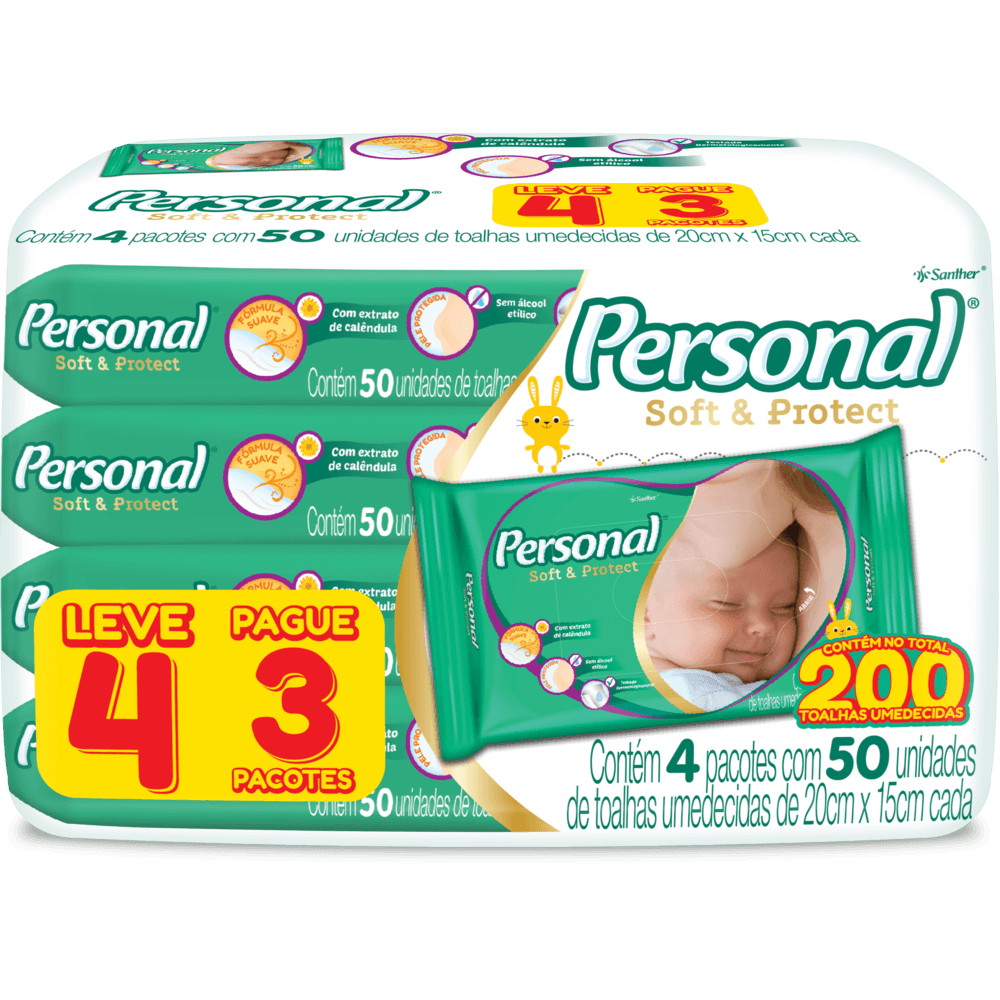 Lenços Umedecidos Personal Baby Soft & Protect Leve 4 Pague 3 com 4 pacotes com 50 lenços - total de 200 lenços