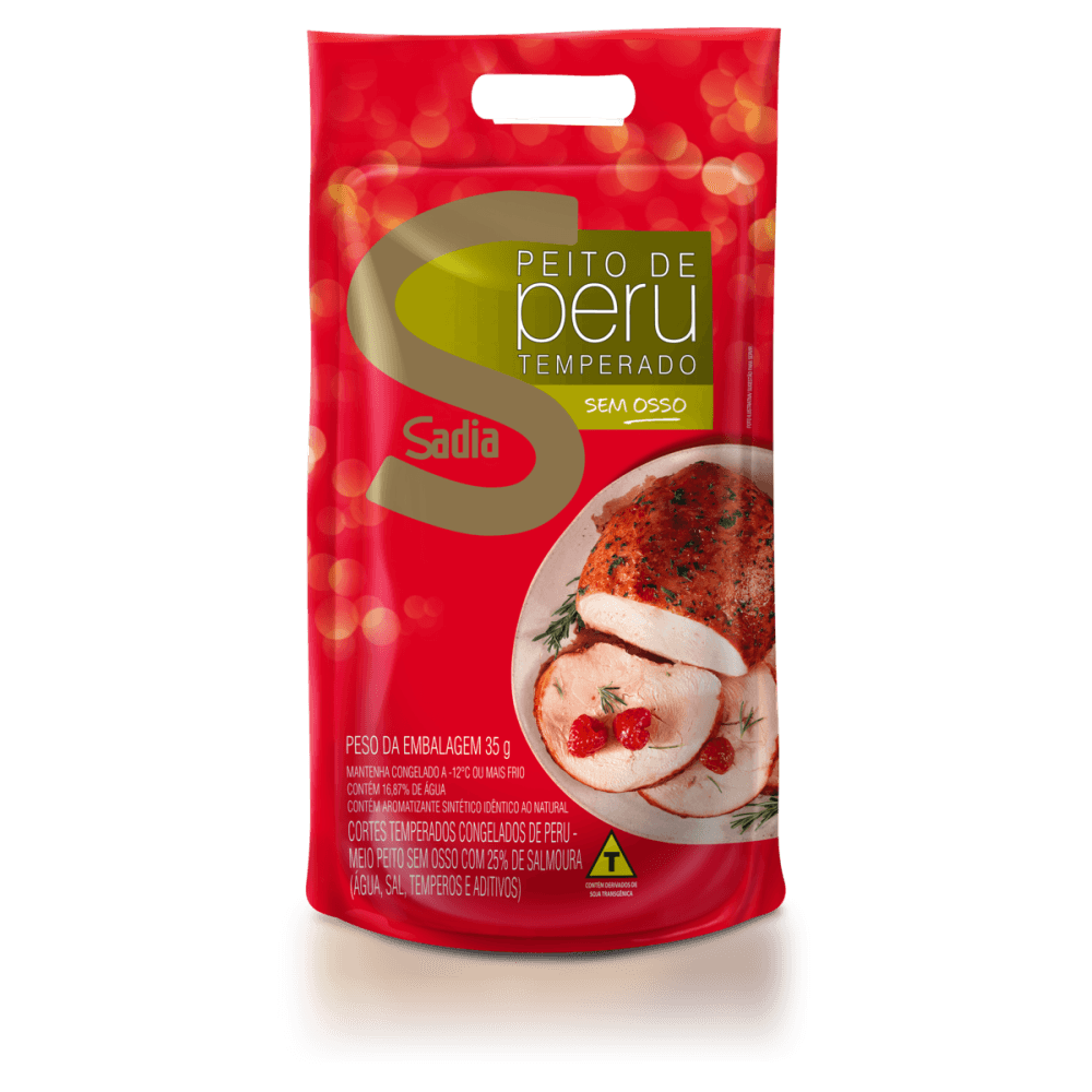 ingredientes: peito de peru, água (16,87%), sal, proteína de soja (0,92%) **, açúcar, vinagre branco, cebola, alho, aromatizantes: aromas naturais e aroma idêntico ao natural, estabilizantes: tripolifosfato de sódio e hexametafosfato de sódio, antioxidante: isoascorbato de sódio, realçador de sabor: glutamato monossódico. ** bacillus thuringiensis, streptomyces viridochromogenes e agrobacterium tumefaciens.