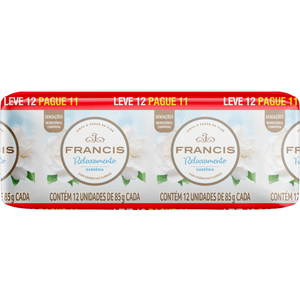benefícios: embalagem econômica: leva 12 unidades e paga 11. elaborado com essências florais de gardênia. propriedades relaxantes. indicado para toda a família. fórmula exclusiva que higieniza e amacia a pele. sabonete suave em barra francis hidrata a pele. perfumação aromacológica.
