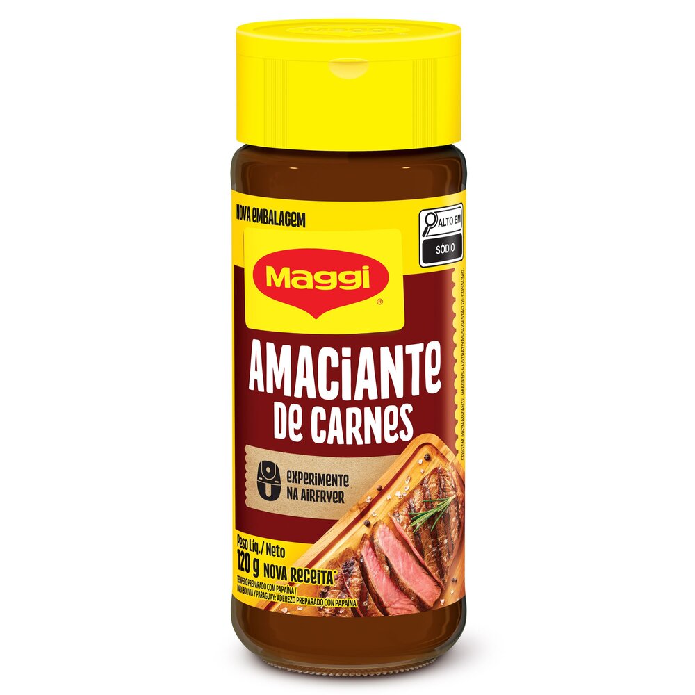 sal, farinha de milho enriquecida com ferro e ácido fólico, óleo vegetal de palma, papaína, pimenta-do-reino, salsa, cebola, alho, realçador de sabor glutamato monossódico, antiumectante dióxido de silício, acidulante ácido cítrico, corante natural cúrcuma e aromatizantes.