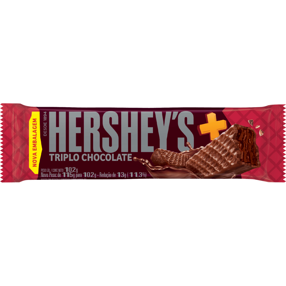 descrição de marketing: hershey's mais triplo chocolate é combinação de 3x chocolate! nesta versão o chocolate está em tudo: wafer, recheio e cobertura, pra quem ama mesmo chocolate hershey's!