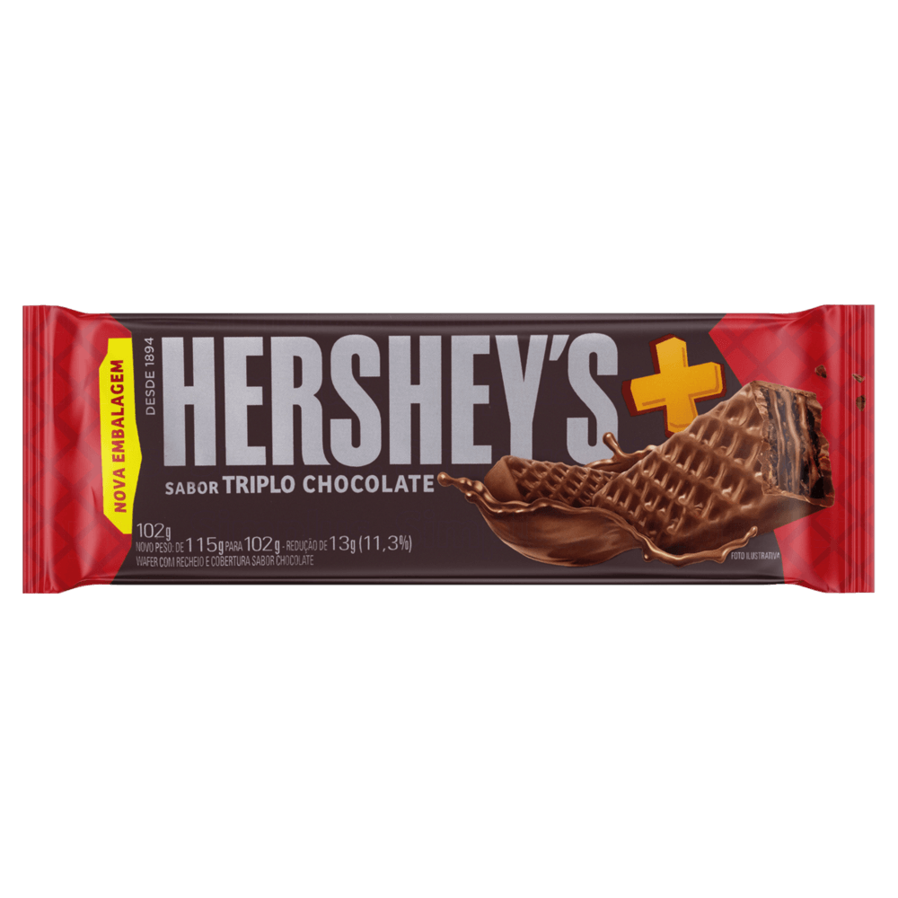 descrição de marketing: hershey's mais triplo chocolate é combinação de 3x chocolate! nesta versão o chocolate está em tudo: wafer, recheio e cobertura, pra quem ama mesmo chocolate hershey's!
